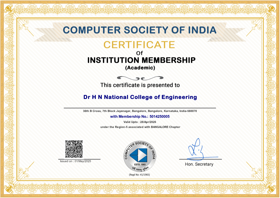 The Computer Society of India (CSI), established on 6 March 1965, is the premier professional society for IT professionals in India and a recognized member of the International Federation for Information Processing (IFIP). The CSI Student Chapter at Dr. HNNCE is led by Dr. Vikhyath K B, Associate Professor in the CSE department.